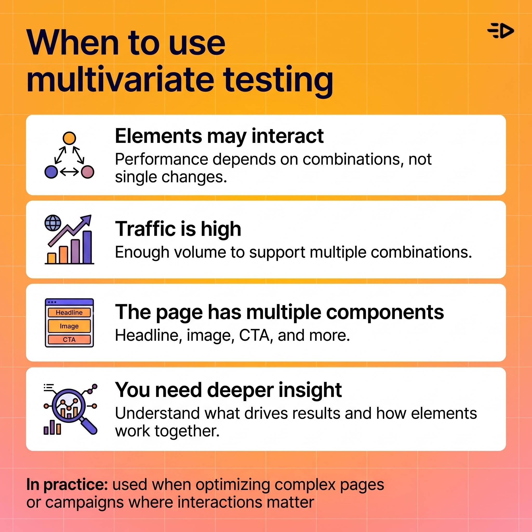 Multivariate testing becomes useful when different audience segments may respond differently to different combinations of creative, copy, offer, and layout. Instead of picking one winner for everyone, you're finding which combination works best for which segment.