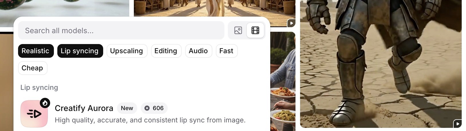 モデル検索で「Creatify」または「Aurora」と検索するか、「リアルな」と「リップシンク」のタグで絞り込んでAuroraを見つけます。